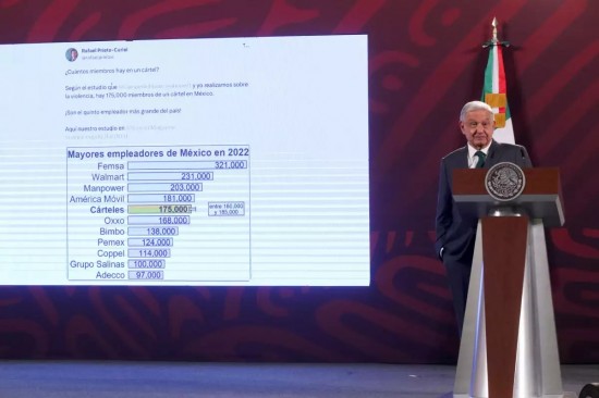 “Salió una nota también de la derecha, de los conservadores, diciendo que los empleos que se generan en México vienen del narcotráfico... eso es falso y lo puedo probar. Quién está ofreciendo más empleo es la industria de la construcción y tiene que ver con la inversión pública”, comentó. El estudio Reducir el reclutamiento de cárteles es la única forma de disminuir la violencia en México (Reducing cartel recruitment is the only way to lower violence in Mexico) revela que en el país alrededor de 175,000 personas están empleadas por organizaciones criminales. De ellas, el 17.9% estaría afiliada al Cártel Jalisco Nueva Generación, el 8.9% al Cártel de Sinaloa, el 6.2% a la Nueva Familia Michoacana, el 4.5% al Cártel del Noreste, el 3.5% a la Unión Tepito y el 59% a otras organizaciones. De acuerdo con el estudio, el primer empleador es Femsa, seguido por Walmart, Manpower, America Movil y los Cárteles. El mandatario federal dijo que la obra pública que se está realizando en el país está generando miles de empleos. “50,000 nada más de una empresa que está trabajando en el Tren Maya... nos ha ayudado mucho el que haya inversión pública y quiero comentar también a quienes viven en el norte quienes viven en el centro que no significa que no haya crecimiento en el norte y en el centro es que ahora estamos buscando pues el equilibrio y que el crecimiento sea horizontal parejo”, destacó. En su gobierno se han construido obras como el Aeropuerto Internacional Felipe Ángeles, la refinería Olmeca y está en construcción el Tren Maya. |