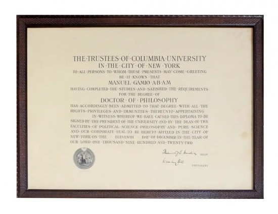 Al acto realizado en el MNA, acudió la vicepresidenta de la American Society of Mexico, Patricia González; el director general del Instituto Nacional de Antropología e Historia, Diego Prieto Hernández, y el maestro Juan Manuel Herrera Huerta, quien hizo entrega de ambos documentos que localizó de manera fortuita. Acompañado del secretario técnico y de la coordinadora nacional de Arqueología, José Luis Perea González y Martha Lorenza López Mestas, el antropólogo Prieto Hernández señaló que ambos documentos serán parte de los tesoros más preciados del ANA, “el más importante del devenir de la arqueología en nuestro país y, probablemente, de América”. Herrera Huerta puntualizó que el hallazgo de los títulos que otorgará la Universidad de Columbia, en Nueva York, Estados Unidos, a Manuel Gamio, es corolario de las cuatro décadas que ha dedicado a la protección, organización y difusión de los archivos mexicanos en instituciones como el Archivo General de la Nación, el Poder Judicial de la Federación y la Biblioteca Miguel Lerdo de Tejada. Informó que en su pasión por descubrir obras de arte en mercadillos y tiendas de antigüedades, en una serie de cuadros que había sacado el anticuario Mario Flores, en su puesto de la calle Córdoba, en la colonia Roma Norte de la capital mexicana, se sorprendió cuando vi “en forma inverosímil, dos cuadros que corresponden a los títulos de maestro y doctor de don Manuel Gamio”. El primero lleva la fecha 7 de junio de 1911 y, el segundo, 11 de diciembre de 1922. Ambos están firmados por Nicholas Murray Butler (1862-1947), entonces presidente de la Universidad de Columbia, y quien recibiría el Premio Nobel de la Paz, en 1931; y por Frederick J. E. Woodbridge (1867-1940). Los títulos conservan su marco original, realizados por la Casa C. Pellandini. Vidrios y cristales. Doraduría y Papel Tapiz, en el número 33 de la calle Madero, en el Centro Histórico de Ciudad de México. Herrera Huerta hizo notar que los conocedores de la vida y obra de Gamio saben que el lapso que media entre estos diplomas, no fue para él un periodo de formación académica, en sentido estricto, sino de grandes experiencias en campo, muchos de ellos trabajos pioneros. “De suerte que estos documentos forman un arco temporal y de memoria fundamentales para nuestro país”. En un mensaje grabado para la ocasión, la cronista Ángeles González Gamio rememoró que el ofrecimiento de una beca para Manuel Gamio –su abuelo– para estudiar antropología en la Universidad de Columbia, fue gracias a la recomendación que hiciera la antropóloga Zelia Nuttall a Franz Boas, destacando sus exploraciones en Chalchihuites, Zacatecas. Llegó a dicha universidad en 1909, y se inscribió en las cátedras de los profesores Adolfo Bandelier, Marshall H. Saville y del propio Boas, de quien Gamio llegó a referir que aprendió dos grandes lecciones: “En la primera, negaba que existiesen innatas superioridades o inferioridades raciales que determinaran el progreso o el retraso de los pueblos […]; en la segunda, hacía resaltar la poderosa influencia que el ambiente ejerce no solo en el desarrollo cultural de los hombres sino también en el físico, el cual no se debe exclusivamente a la acción de la herencia”, añadió Ángeles González. El investigador emérito del INAH, Eduardo Matos Moctezuma, reconoció que los conocimientos adquiridos por Gamio en aquella institución le llevarían a aplicar, por vez primera, la técnica estratigráfica de excavación en México, particularmente en un sitio de Azcapotzalco; asimismo, sería el descubridor de los restos del Templo Mayor. “Su visión integral de la antropología la aplicaría en el proyecto La población del Valle de Teotihuacan, publicado hace un siglo, en tres volúmenes, y base de su tesis doctoral. Esa investigación, realizada por mexicanos, no solo hurgó en el pasado, sino que mejoró las condiciones de los habitantes de la región y fue reconocida a nivel mundial”, dijo Matos Moctezuma. “A partir de aquel momento, esta concepción integral de la antropología, que Gamio trazó al involucrar la arqueología, la antropología física, la etnología y la lingüística, trascendió, y un ejemplo claro es la Escuela Nacional de Antropología e Historia, donde se continúan formando estudiantes en esas y otras especialidades. “Es de felicitar y de agradecer a Juan Manuel Herrera Huerta la donación de estos documentos, porque nos devuelve a un momento histórico, no solo para la arqueología, sino para la antropología en México”, concluyó el especialista. |