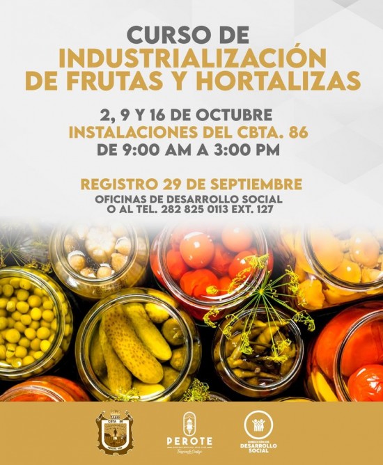 🎉 La Dirección de Desarrollo Social te invita a participar en nuestro curso de Industrialización de Frutas y Hortalizas, completamente GRATIS. 📅 Fechas: 2, 9 y 16 de octubre. 🕘 Horario: 9:00 am - 3:00 pm. 📍 Lugar: Cbta 86, Perote. Recuerda, el registro será el 29 de septiembre, ¡es un cupo limitado! Para inscripciones y más información, contáctanos al 📞 282 825 0113 ext. 127 o visítanos en nuestras oficinas de Desarrollo Social en el Palacio Municipal. ¡No pierdas esta oportunidad de aprender y crecer con nosotros! 🌟 |