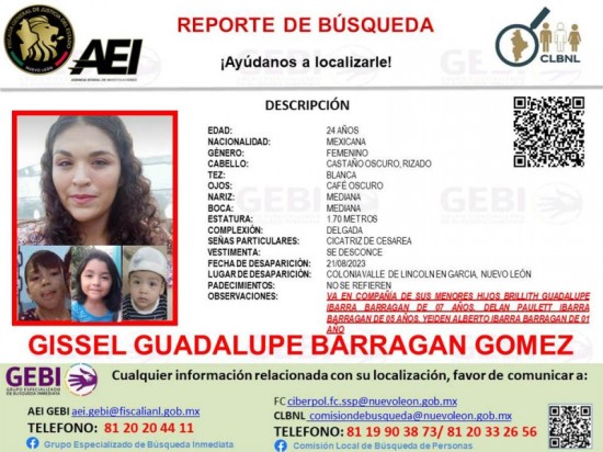 | Gissel Guadalupe de 24 años desapareció junto a sus tres hijos en Nuevo León. | ||||||
