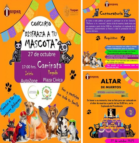Tuxpan, Ver.- ¿Quieres disfrazar a tu mascota? El Gobierno de Tuxpan te invita al concurso de disfraces alusivo a Día de Muertos, que se realizará en la explanada de la Presidencia Municipal. Participar es gratuito y se premiará a los 3 mejores.