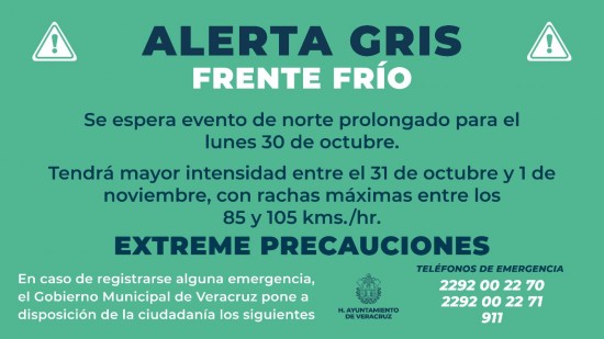 XALAPA.- La Secretaría de Protección Civil (PC) emitió la alerta gris para los días lunes 30 y martes 31 de octubre, debido al Frente Frío número 8 (FF8), pues se prevé una baja en las temperaturas del territorio veracruzano. De acuerdo con PC, el frente frío se quedará en el sur hasta el jueves 2 de noviembre. El fenómeno provocado por una potente masa de aire frío del Ártico afectará a la entidad con lluvias fuertes, norte intenso, oleaje elevado y descenso de temperatura. El estado del tiempo para Todos Santos será frío en la entidad veracruzana, por lo que Protección Civil emitió un mensaje para que las familias se preparen ante las condiciones climatológicas que se sentirán la siguiente semana. Con base a los pronósticos del clima, se sabe que el ingreso del Frente Frío número 8 será a partir de las 4 de la tarde desde Tampico y Tamaulipas, el día lunes 30 de octubre. Para las 7 de la noche el fenómeno climatológico legaría al puerto de Tuxpan en el norte veracruzano. Para el puerto de Veracruz, el frío comenzaría a las 2:00 de la mañana, recorrerá hasta Coatzacoalcos entre las 3 y 4 de la tarde del martes 31 de octubre, detalla la alerta gris. También se prevé un potencial de lluvias y tormentas con ráfagas de viento y actividad eléctrica que aumentará a partir de la tarde-noche del próximo lunes 30, con mayor intensidad entre el martes 31 octubre y el miércoles 1 de noviembre. “Se estiman acumulados en 24 horas de 10 a 30 milímetros en promedio en el estado y máximos de 70 a 150 milímetros, siendo probables mayores a 150 mm, especialmente en la zona sur. De igual forma, se prevé un norte prolongado con rachas máximas de 85 a 105 kilómetros por hora en la costa central-sur, 75 a 90 kilómetros por hora en la costa norte, menores, pero con rachas fuertes en llanuras”. En las zonas de montaña entre Xalapa, Naolinco, Misantla y el valle de Perote se prevén rachas de viento de 45 a 65 kilómetros por hora, que disminuirán gradualmente el jueves 2 de noviembre, generando oleaje de 3 a 5 metros cercano al litoral y notable descenso de temperatura entre el martes 31 y el jueves 2 refiere la información de manera oficial.