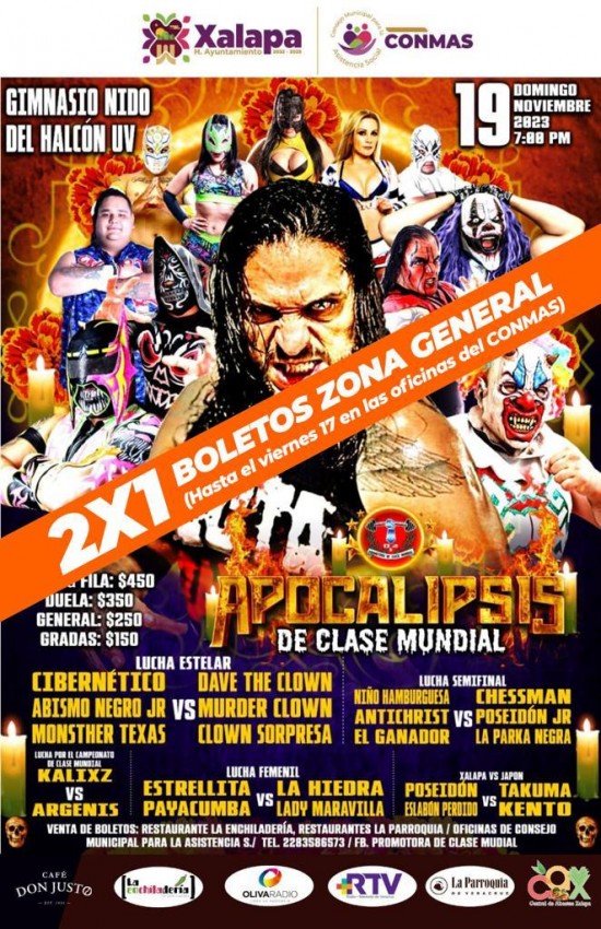 XALAPA.- El Consejo Municipal para la Asistencia Social (Conmas) reitera la invitación para asistir al evento de Lucha Libre con Causa “Apocalipsis de Clase Mundial”, que se desarrollará el domingo 19 de noviembre, a las 19:00 horas, en El Nido de El Halcón.