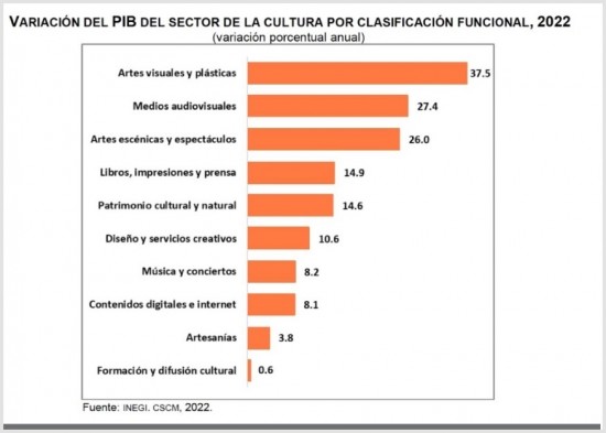 El organismo autónomo detalló que las áreas con mayor contribución al PIB del sector fueron las artesanías, que generaron 19.3 por ciento; los contenidos digitales e Internet –como el acceso y la transmisión de contenidos digitales– contribuyeron con 18.6 por ciento; los medios audiovisuales, como televisión o cine, aportaron 18 por ciento, y la participación del diseño y servicios creativos fue de 12.8 por ciento. Por etapas del ciclo cultural, el PIB del sector se conformó por creación, que se refiere a las actividades como propiedad intelectual, que contribuyó con 15.9 por ciento; producción, con 14.7 por ciento; transmisión y difusión –como espectáculos en vivo o radiodifusión– aportó 35.7 por ciento; consumo, 22.3 por ciento; preservación, 3.6, y formación –como la educación relacionada con el sector cultural— aportó 7.8 por ciento. El sector generó más de un millón 494 mil plazas En el año de referencia, las áreas del sector cultura con mayor crecimiento fueron artes visuales y plásticas, con 37.5 por ciento; medios audiovisuales, con 27.4 por ciento; artes escénicas y espectáculos, con 26; libros, impresiones y prensa, con 14.9; patrimonio cultural y natural, con 14.6, y diseño y servicios creativos, con 10.6 por ciento. El resto de las áreas del sector presentaron crecimientos menores a 10 por ciento. El Inegi señaló que el año pasado, las actividades económicas del sector cultural generaron más de un millón 494 mil puestos de trabajo, dato que representa 3.6 por ciento del total nacional. Además, se observó un incremento de 2.5 por ciento en dicho año, lo que representa un aumento de 36 mil 725 puestos respecto a 2021. Las áreas que generan mayor aportación a los puestos de trabajo del sector cultural son las artesanías que generaron 31.4 por ciento; el diseño y los servicios creativos aportaron 14.1 por ciento; los medios audiovisuales, 12.4 por ciento y los libros, impresiones y prensa, 8.3 por ciento del sector. |