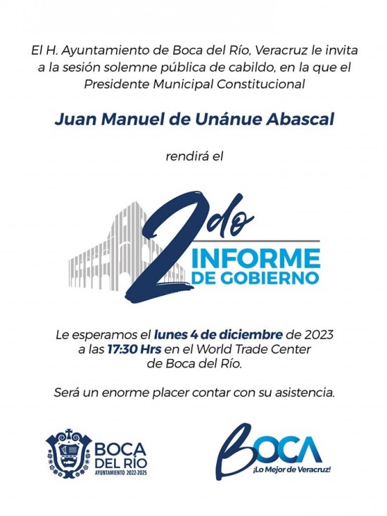Por eso los invito a que me acompañen en mi Segundo Informe de Gobierno el próximo lunes 4 de diciembre en el WTC en punto de las 17:30 horas.