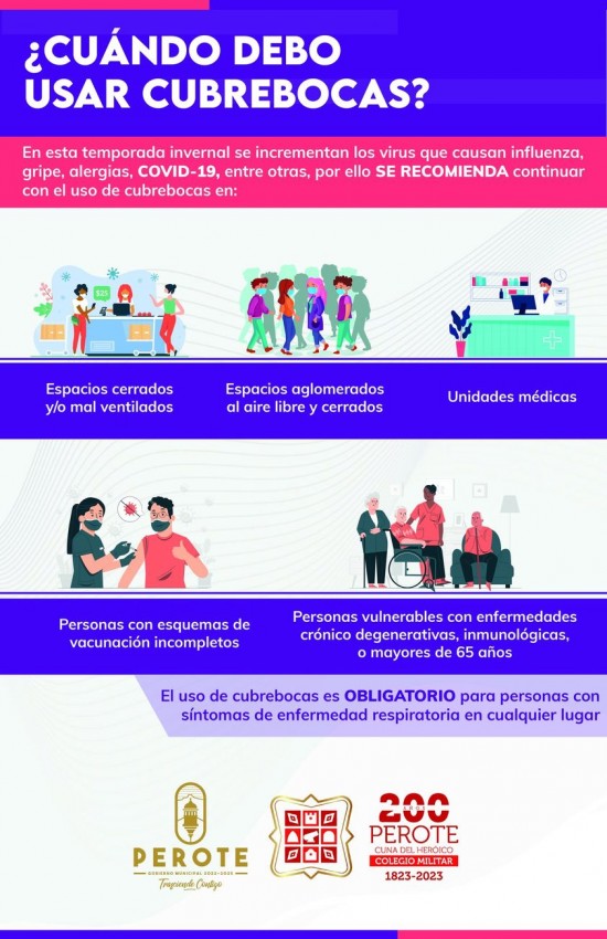 En esta temporada de invierno donde incrementan los virus como el COVID-19, influenza, gripes y más, se recomienda el uso de cubrebocas en espacios cerrados, aglomerados o donde haya riesgos de contagio. Tu compromiso con el uso del cubrebocas es esencial para mantener un entorno seguro para todos y proteger a nuestra comunidad. |