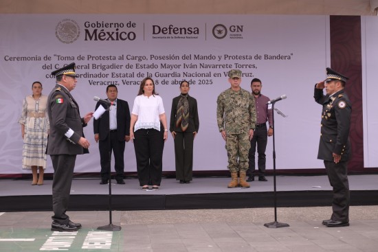 XALAPA.- El General Brigadier de Estado Mayor Iván Navarrete Torres tomó Protesta al Cargo, Posesión del Mando y Protesta de Bandera como Coordinador Estatal de la Guardia Nacional en Veracruz. En las instalaciones de la Coordinación Estatal de Veracruz Cabeza Olmeca, tras los honores correspondientes a los símbolos patrios, se dio lectura al amplio currículum vitae del nuevo mando. Destaca una trayectoria profesional forjada a través de la rigurosa escala jerárquica dentro de la Secretaría de la Defensa Nacional. A lo largo de más de 34 años de servicio ininterrumpido en diversos organismos de la Secretaría de la Defensa Nacional ha recibido las distinciones de Perseverancia en primera, segunda, tercera, cuarta y quinta clase, así como las condecoraciones por Distinción Militar, Servicios Distinguidos y, en tres ocasiones, la Condecoración al Mérito en la Lucha contra el Narcotráfico. En la ceremonia estuvo presente la gobernadora de Veracruz, Rocío Nahle, el secretario de Gobierno, Ricardo Ahued, así como los comandantes de la 1ª Región Naval, Carlos Eduardo L'Église Escamilla; de la 26ª Zona Militar, Miguel Ángel Rodríguez Gutiérrez; y del 16º Batallón, Héctor Daniel Guzmán Bonilla, así como integrantes de la Mesa de Seguridad.