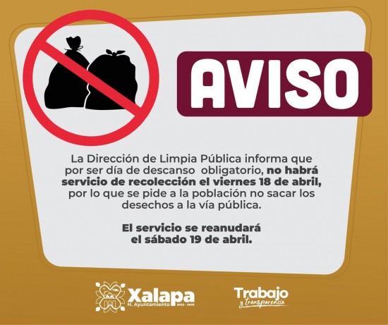Por ser día de descanso obligatorio, el viernes 18 de abril no habrá servicio de recolección de desechos urbanos, informó la Dirección de Limpia Pública.