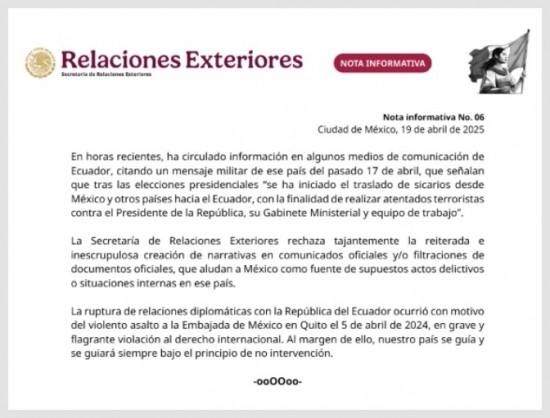 CDMX.- La presidenta Claudia Sheinbaum respaldó la respuesta oficial que dio la Secretaría de Relaciones Exteriores ante las versiones oficiales y extraoficiales de Ecuador de que sicarios mexicanos estarían ingresando a ese país para efectuar ataques. La mandataria cuestionó que ni siquiera se hayan dado fuentes de esta información ni hay pruebas elementales que lo sustenten.