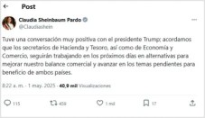 Al abundar en lo que ya había escrito en sus redes sociales, Sheinbaum dijo que fue una conversación breve (15 minutos) pero muy cordial, donde ambas partes dejaron claro que hay un deseo de México y Estados Unidos de que alcancemos mejores condiciones en el intercambio comercial., Reconoció que la principal preocupación del gobierno estadounidense es reducir el déficit comercial que tienen con México. Dijo que en este contexto, nuestro país está buscando la forma de incrementar las importaciones desde Estados Unidos. Esto representaría ampliar el intercambio comercial bilateral. Por su parte, México expresó su postura de revisar la imposición de aranceles al acero, el aluminio y a las exportaciones automotrices a Estados Unidos . Explicó que se acordó continuar las conversaciones entre los secretarios de Hacienda Mexicano, EdgarAmador Zamora y del Tesoro estadounidense, Scott Bessent, así como el secretario de Economía, Marcelo Ebrard y de Comercio de Estados Unidos Howard Lutnick. Sheinbaum comentó que desde hace unas semanas se había solicitado un nuevo acercamiento telefónico con Trump y anoche, la Casa Blanca solicitó que se realizara esta mañana a las 7:30 por lo que se postergó la conferencia presidencial a las 9 horas. Sheinbaum informó en X que la conversación fue breve, cordial y centrada en temas comerciales La presidenta Claudia Sheinbaum informó a través de sus redes sociales de la nueva conversación telefónica con su homólogo estadunidense, Donald Trump, esta mañana del Día del Trabajo-. Ahí la mandataria la calificó como “muy positiva”, con acuerdos para continuar conversaciones en materia comercial y en otros temas de la agenda bilateral. “Tuve una conversación muy positiva con el presidente Trump: acordamos que los secretarios de Hacienda y del Tesoro, así como Economía y Comercio, seguirán trabajando en los próximos días en alternativas para mejorar nuestro balance comercial y avanzar en los temas pendientes para beneficio de ambos países”. Con esta ya son seis conversaciones telefónicas entre ambos mandatarios, cinco de las cuales han tenido un carácter oficial. El intercambio se ha intensificado a partir de los anuncios de Trump de imponer aranceles no solo a México y a Canadá sino al mundo entero. En las pasadas pláticas, Sheinbaum ha conseguido prórrogas en la entrada en vigor de estas cuotas compensatorias. Desde anoche, la mandataria modificó el horario de la conferencia matutina misma que se recorrió del horario habitual de 7:30 a las 9 de la mañana. ![]() Imagen del mensaje difundido por la presidenta Claudia Sheinbaum a través de su cuenta en X. Imagen tomada de @Claudiashein |