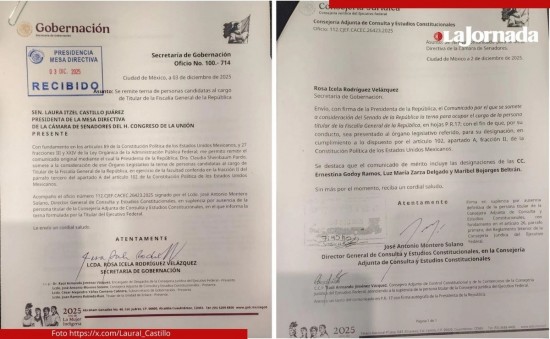 Las tres aspirantes comparecerán ante el pleno del Senado durante la sesión de hoy y responderán a tres rondas de preguntas de todos los grupos parlamentarios. Después se procederá a la votación en urnas y la nueva fiscal general de la república deberá ser electa con mayoría calificada, es decir las dos terceras partes de los senadores presentes. Godoy Ramos fue también fiscal de la Ciudad de México, mientras que Maribel Bojórquez Beltrán, es abogada con trayectoria en materia penal y administrativa, y ha ocupado diversos cargos públicos. funcionaria en distintas dependencias federales. La tercera candidata propuesta, Luz María Zarza, fue consejera jurídica en el Estado de México y es experta en derecho administrativo y constitucional. La Presidenta del Senado, Laura Itzel Castillo, informó esta mañana a través de sus redes sociales que esa cámara del Congreso ya a recibió el oficio enviado por la presidenta Claudia Sheinbaum Pardo con la terna de candidatas para ocupar la titularidad de la Fiscalía General de la República (FGR), vacante tras la renuncia de Alejandro Gertz Manero. Expuso que las propuestas por la mandataria son tres mujeres con trayectoria en el ámbito jurídico y público, quienes deberán comparecer ante el pleno del Senado y responder a los cuestionamientos de los grupos parlamentarios, antes de que una de ellas se electa como la nueva titular de FGR. El Senado ya citó a comparecer a las integrantes de la terna, de las que hoy saldrá la titular de la FGR, por un período de nueve años. |