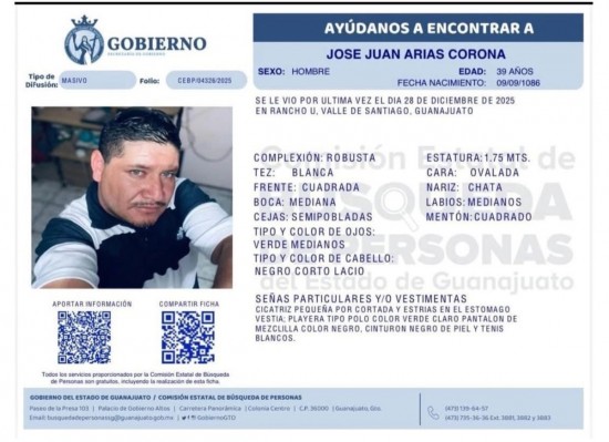 De acuerdo con los datos de la ficha de búsqueda de la Fiscalía General del Estado de Guanajuato, José Juan Arias Corona, de 39 años de edad, fue visto por última vez el pasado domingo 28 de diciembre en el Rancho U.