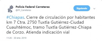 Explicaron que los cierres comenzaron desde las 7:00 horas, tiempo local, en la vía Tuxtla Gutiérrez-Chiapa de Corzo, a la altura del puente Belisario Domín... 2019-01-30 13:26:43 |