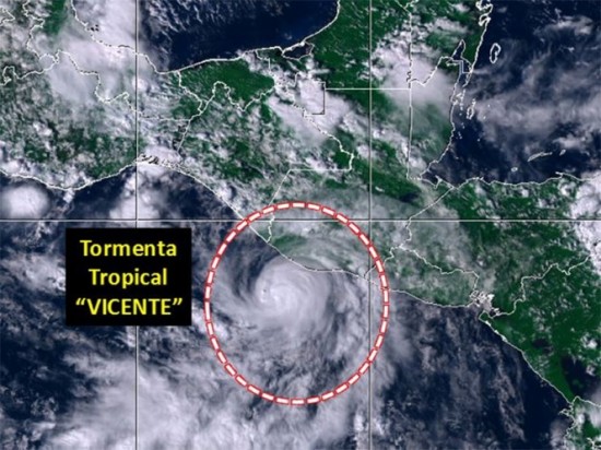 En su cuenta de Twitter @conagua_clima, publicó la imagen de la tormenta tropical "Vicente" avanzando hacia la costa de Chiapas.