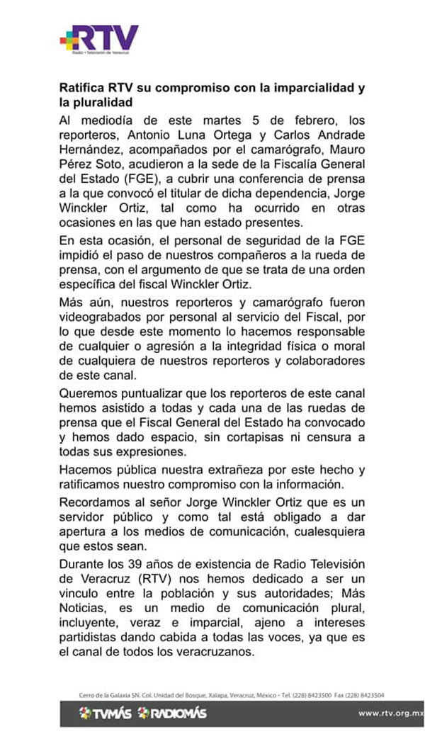 RTV responsabiliza a Winckler de cualquier agresión de sus reporteros y colaboradores. | ||||