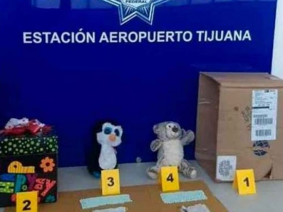 .- Elementos de la Policía Federal aseguraron un paquete con dos muñecos de peluche que en su interior llevaban 600 pastillas de aparente fentanilo, en una empresa de mensajería y paquetería en el municipio de Tijuana, Baja California.