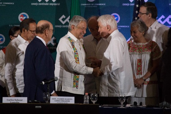 En el marco de la clausura del XI diálogo del gobierno de México con los directores generales de empresas estadunidenses con inversiones en Mexico, ante el presidente Andres Manuel López Obrador, Donahue destacó que preservar la relación vital méxico-estadunidense es una prioridad de la Cámara. Por eso, aseveró, los aranceles impuestos al acero y al aluminio deben ser retirados antes de que se apruebe el tratado comercial para América del Norte. Poco antes, como parte de los trabajos del encuentro, la secretaria de Economía, Graciela Márquez, había sostenido un encuentro privado con el secretario de Comercio estadunidense, Wilbur Ross, a quien le planteó la preocupación del gobierno mexicano acerca de los cierres parciales en la frontera y la reducción del personal en los cruces fronterizos porque ello impacta en los flujos comerciales. Durante el evento público Donahue subrayó que más de medio millón de personas cruzan diariamente de forma legal la frontera para trabajar, acudir a la escuela o como turistas, lo que expresa la vitalidad de la relación bilateral. Por ello, dijo, han estado "hombro a hombro" con México cuando la situación en la frontera se complicó. Al mismo tiempo subrayó la importancia de respetar la santidad de los contratos y la preservación del estado de derechos para que las empresas se desarrollen con altos estándares de ética de la iniciativa privada. Donahue dijo que Estados Unidos tiene el nivel más bajo de desempleo en 65 años "pero se nos acabaron las personas , así que la comunidad empresarial busca los esfuerzos de expandir la fuerte de talento e impulsar una nueva ley de migración en su país. En su oportunidad, el presidente del Consejo Coordinador Empresarial, Carlos Salazar, destacó los esfuerzos que se han hecho para consolidar la relación entre los que destacó la importancia de que avanzara la aprobación de la reforma laboral en el Congreso, como parte de los pasos adelante para la aprobación del acuerdo comercial. |