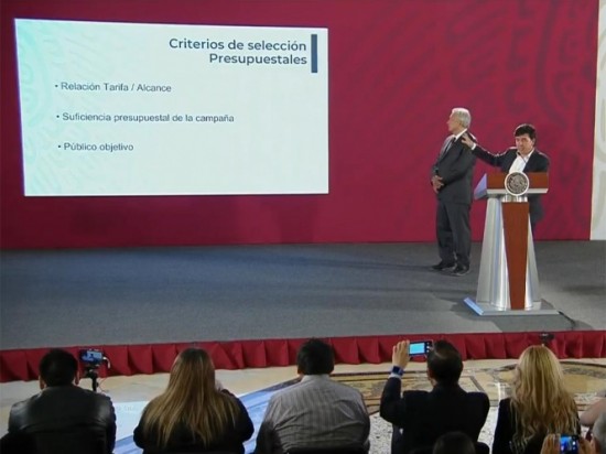 En el acuerdo emitido en el Diario Oficial de la Federación, explicó que la honestidad será la premisa básica para acabar con la selección discrecional en la contratación de medios de comunicación para implementar la estrategia de comunicación social del gobierno federal. Ante ello, apuntó en el documento vigente a partir de mañana, se deberán seleccionar los medios y las vías de comunicación de acuerdo a la normativa aplicable para cumplir con este principio. Sostuvo que el combate a la corrupción en esta materia se logrará mediante la transparencia para informar el destino de los recursos asignados para la contratación de medios de comunicación a través de las vías que se estimen pertinentes. Definió propaganda gubernamental o campañas de promoción y publicidad como como toda producción y difusión en cualquier medio de comunicación o soporte tecnológico o digital solventada con recursos públicos, así como aquella que promueva o publicite la venta de productos o servicios que generen algún ingreso para el Estado. Resaltó que las campañas o programas que sean difundidas a través de propaganda gubernamental deberán tener carácter institucional con fines informativos, educativos, de orientación social o de rendición de cuentas conforme al Programa Anual de Comunicación Social de cada dependencia o entidad. Asimismo, podrá utilizar los medios, soportes y formatos que garanticen el acceso a la información y aseguren la difusión de acuerdo con el propósito y características de cada campaña y garantizar la difusión de la información institucional en condiciones de igualdad entre la población objetivo. Indicó que las campañas de comunicación social o de promoción y publicidad institucional deberán respetar y reflejar la pluralidad del país, considerando estados y municipios respecto a su composición étnica, diversidad cultural, religiosa, lingüística y riqueza geográfica, además de fomentar la igualdad y no discriminación, y promover los derechos humanos y la convivencia armónica. La Presidencia de la República señaló que la propaganda gubernamental podrá informar sobre ejecución de obras de infraestructura, prestación de servicios públicos y desarrollo de programas económicos y sociales, rendición de cuentas, promoción y garantía de derechos humanos y funcionamiento de instituciones. Asimismo, sobre medidas preventivas de protección civil, difusión de campañas de salud y nutrición, de respeto a la integridad física y familiar, de protección a los grupos de personas o de sectores de población históricamente desprotegidos, así como las leyes, reglamentos y decretos que tenga relevancia para el ejercicio de los derechos de las personas, además de promoción del turismo. Por el contrario, detalló que las dependencias y entidades públicas federales no podrán difundir el contenido de la propaganda gubernamental que tenga por finalidad destacar, de manera personalizada, nombres, imágenes, voces o símbolos de cualquier servidor público ni difusión del informe anual de labores del Ejecutivo federal. Tampoco podrán divulgar mensajes discriminatorios, sexistas o contrarios a los valores, principios y derechos constitucionales, fomente la comunicación engañosa, restrinja la transmisión y circulación de ideas y opiniones o que sea utilizada como un mecanismo de censura, incite a la violencia o a comportamientos contrarios al ordenamiento jurídico, entre otras. Aclaró que las dependencias y entidades públicas emitirán un comunicado de prensa cuando cuenten con la autorización de las autoridades competentes y el monto autorizado para realizar ampliaciones presupuestales en materia de comunicación de conformidad con las disposiciones aplicables. Estableció la prohibición para que un medio de comunicación concentre un porcentaje mayor a 25 por ciento del total de la pauta publicitaria que esté en una campaña particular a cargo de una dependencia o entidad, salvo que se trate de la producción de los materiales a divulgar. Cuando se trate de producción de materiales debe privilegiarse su elaboración en medios públicos y, en caso contrario, indicó que se requerirá la validación de la Coordinación General de Comunicación Social y Vocería del Gobierno de la República. Expuso que las dependencias y entidades de la administración pública federal deberán elaborar la Estrategia Anual de Comunicación Social y, en su caso, de promoción y publicidad, para efectos de la difusión de mensajes de campañas de comunicación social. Además, dio a conocer, estas instancias estarán en condiciones de realizar estudios pre-test con la finalidad de conocer el impacto, comprensión y grado de aceptación que pueda tener entre el público objetivo una propuesta de campaña. De igual manera, deberán publicar en sus portales de transparencia la información relativa al gasto de campañas de comunicación social (proveedor, tipo de medio o servicio, contrato, factura, entidad o dependencia) y estar disponible en formatos abiertos para su utilización, agregó el documento firmado por el vocero de la Presidencia, Jesús Ramírez Cuevas. |