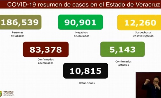 | Veracruz reporta 5,143 casos activos de COVID-19; van 10,815 muertes y 83,378 contagios. |