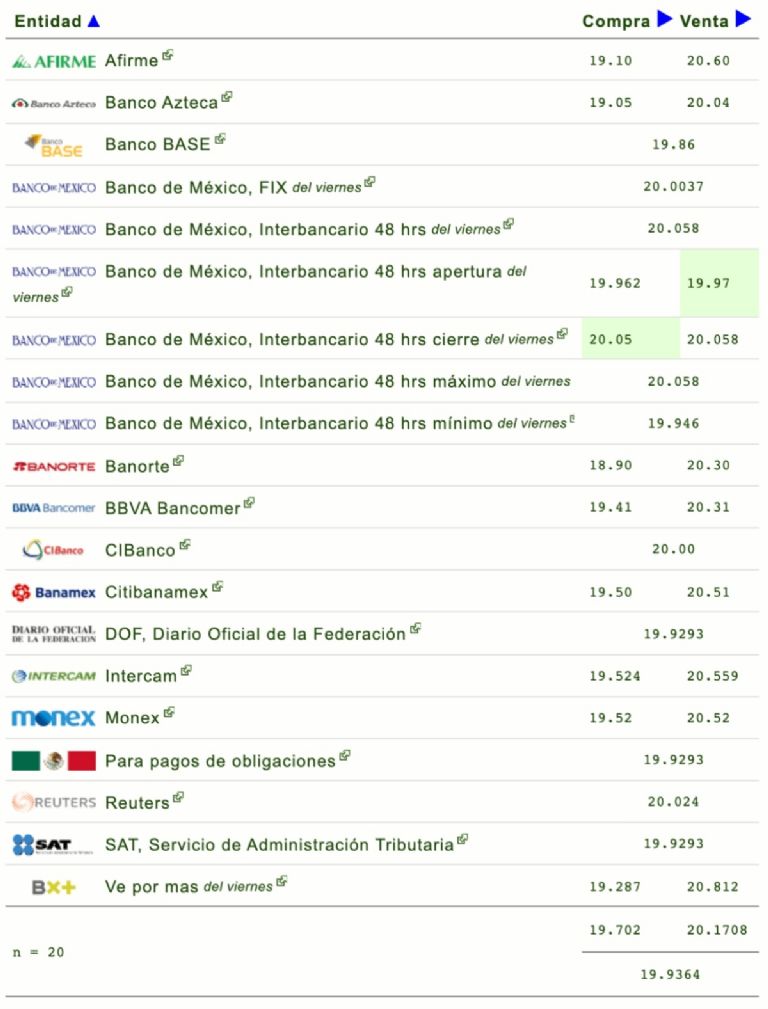 De acuerdo con los promedios de los principales bancos en México, el dólar estadounidense tiene un valor de compra de 19.70 pesos por dólar mientras que su valor de venta es de 20.17 pesos por cada dólar americano: Compra: 19.70 Venta: 20.17 El peso mexicano retrocedía el viernes y se enfilaba a cerrar la semana con pérdidas arrastrado por una fortaleza global del dólar, luego de la publicación de datos positivos de creación de empleo no agrícola en Estados Unidos durante julio. La bolsa, por otra parte, cerró la jornada con un ligero declive, aunque anotó su cuarta ganancia semanal consecutiva, mientras los inversionistas se mantenían a la espera de la votación de un plan de infraestructura en Estados Unidos el fin de semana. ![]() La moneda cotizaba en 20.0422 por dólar casi al final de la sesión, con una depreciación del 0.64% frente al precio de referencia de Reuters del jueves. En la semana, el peso acumuló una caída de un 0.94%. "Este es el segundo mes que el dato de empleo de Estados Unidos supera las expectativas del mercado", dijo Gabriela Siller, directora de análisis de Banco Base. "(Esto) apoya la especulación de que la Reserva Federal muestre un cambio en su postura hacia el cierre del año", añadió. El Departamento de Trabajo de Estados Unidos informó que en julio se crearon 943 mil empleos no agrícolas en ese país, por encima de los 870 mil previstos por el consenso de analistas y de los 938 mil registrados el mes anterior. En tanto, el referencial índice S&P/BMV IPC, integrado por las acciones más líquidas del mercado, cedió un marginal 0.04% a 51,113.85 puntos, mientras que en la semana avanzó un 0.48%. "Las señales técnicas positivas en México y en Wall Street podrían mantenerse si este fin de semana se logra la aprobación en el Congreso de Estados Unidos del programa de infraestructura del presidente Joe Biden por un billón de dólares", dijeron analistas de la consultoría MetAnálisis en un reporte. En el mercado de deuda, el rendimiento del bono a 10 años ascendió cuatro puntos base a un 7.04%, mientras que la tasa a 20 años subió cinco a un 7.69%. |