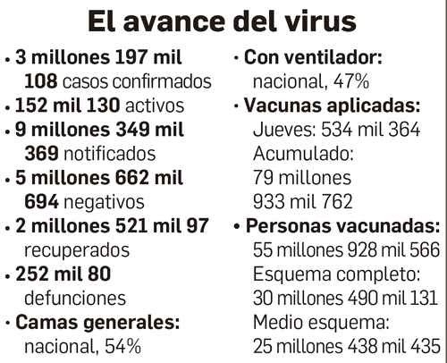 De acuerdo con el semáforo dado a conocer ayer por la Secretaría de Salud, y que estará vigente en la quincena del 23 al 5 de septiembre, Tamaulipas, Nuevo León, Hidalgo, Puebla, Colima, Guerrero y Tabasco estarán en el máximo riesgo por la pandemia de Covid-19. En tanto, en anaranjado estarán, junto con la capital del país, Sonora, Durango, Zacatecas, San Luis Potosí, Nayarit, Jalisco, Aguascalientes, Querétaro, Veracruz, Michoacán, estado de México, Oaxaca, Morelos, Tlaxcala, Campeche y Quintana Roo. En amarillo, Yucatán, Guanajuato, Sinaloa, Chihuahua, Coahuila, Baja California y Baja California Sur. En verde estará Chiapas. En su reporte diario sobre la situación de la epidemia, la dependencia reportó 21 mil 897 nuevos casos confirmados y 761 defunciones. Con esto se han registrado 3 millones 197 mil 108 casos positivos de Covid-19 desde que inició la emergencia sanitaria y 252 mil 80 muertes. La Secretaría de Salud reportó que la tasa nacional de ocupación de camas generales de hospital aumentó un punto porcentual respecto a la víspera, para llegar a 54 por ciento. En tanto, 47 por ciento de las camas con ventilador artificial están ocupadas. En lo que respecta al avance de la Estrategia Nacional de Vacunación, se reportó que el jueves se aplicaron 534 mil 364 dosis de vacunas, para un acumulado de 79 millones 933 mil 762. Con ellas se ha inmunizado a 55 millones 928 mil 566 personas, de las que 55 por ciento cuenta ya con un esquema completo de vacunación, mientras que 45 por ciento, con medio esquema. |