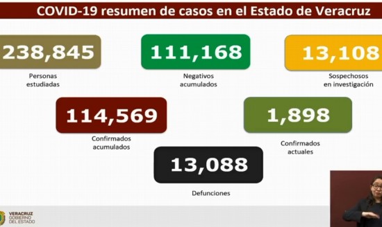 | Veracruz suma 13,088 muertes por COVID-19; se acumulan 114,569 contagios. |