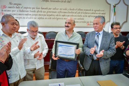 En compañía del alcalde suplente Alberto Islas Reyes, el presidente municipal Ricardo Ahued Bardahuil recibió en la Sala de Cabildo a representantes de distintas organizaciones sindicales integrantes del Frente para la Preservación de la Seguridad Social en el Estado de Veracruz (FPSSEV), quienes le otorgaron un reconocimiento. El Edil externó su agradecimiento y se comprometió a continuar impulsando acciones en favor de la población en su nueva encomienda como Secretario de Gobierno. “Este reconocimiento lo recibo con mucho afecto y emoción, además con el compromiso de no fallarles y continuar poniendo nuestro empeño para contribuir a construir una sociedad mejor”, agregó. Ante el regidor Carlos Ortega Murguía, el Alcalde recordó que cuenta con experiencia legislativa y administrativa al haber ocupado diferentes cargos públicos, experiencia y trayectoria que pondrá al servicio de la ciudadanía. El coordinador del Frente, Juan Delfino Molina Santiesteban, reconoció su trabajo como Presidente Municipal, así como las políticas públicas que se implementaron durante esta Administración en favor de la ciudadanía xalapeña. Tras la entrega del reconocimiento, el Edil dio a conocer los avances que registra el Programa General de Inversión 2024 de la Comisión Municipal de Agua Potable y Saneamiento de Xalapa (CMAS). Además, detalló que durante esta Administración se adquirieron más de 150 mil metros cuadrados de áreas verdes, con el fin de continuar preservando el medio ambiente. El alcalde Ricardo Ahued Bardahuil también se comprometió a seguir apoyando al sector salud y, con ello, brindar una mejor atención a la población. |