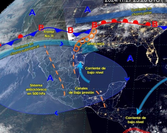 El frente frío 11 recorrerá lentamente el noreste mexicano, generando lluvias y chubascos dispersos en zonas del noreste y oriente de México. La masa de aire polar que lo impulsará cubrirá los estados del noroeste, norte y noreste del país, originando descenso de la temperatura y vientos fuertes con posibles tolvaneras en las regiones mencionadas. Así como heladas en zonas montañosas de Chihuahua, Durango, Estado de México, Puebla, Baja California, Sonora, Michoacán, Guanajuato, Querétaro, Hidalgo, Tlaxcala, Veracruz y Oaxaca. De acuerdo con el comunicado del organismo dependiente de la Comisión Nacional del Agua (Conagua), un canal de baja presión se extenderá sobre el sureste del país y producirá chubascos con posibles descargas eléctricas en Oaxaca, así como lluvias aisladas en Tabasco y Chiapas. Al final del día, iniciará un nuevo evento de “Norte” de 30 a 40 km/h con rachas de 50 a 70 km/h en las costas de Tamaulipas y norte de Veracruz. Clima México: Temperatura máxima hoy 28 de noviembre de 2024 Para hoy 28 de noviembre de 2024 se pronostica ambiente caluroso en Tamaulipas, San Luis Potosí, Sinaloa, Nayarit, Jalisco, Colima, Michoacán, Guerrero, Oaxaca, Campeche y Yucatán con temperaturas de 35 a 40 °C. Así como temperaturas máximas de 30 a 35 °C en Baja California Sur, Sonora (sur), Durango (occidente), Nuevo León, Morelos (sur), Puebla (suroeste), Chiapas, Tabasco y Quintana Roo. Clima en la CDMX y Edomex: se esperan hasta -3 °C En el Valle de México se prevé hoy 28 de noviembre de 2024 ambiente frío a muy frío, con temperaturas de -5 a 0 °C en zonas altas. Por la tarde, ambiente cálido, cielo despejado y sin lluvia en la Ciudad de México (CDMX) y el Estado de México (Edomex). La temperatura mínima pronosticada para la CDMX será de 4 a 6 °C y la máxima de 25 a 27 °C. Para Toluca, Edomex, se prevé una temperatura mínima de -3 a 0 °C y una máxima de 22 a 24 °C. Clima en Nuevo León hoy 28 de noviembre de 2024 De acuerdo con el pronóstico, se espera cielo medio nublado a nublado con chubascos en San Luis Potosí y lluvias aisladas en Nuevo León. Viento del este y noreste de 15 a 30 km/h con rachas de 50 a 70 km/h en Coahuila, Nuevo León y San Luis Potosí. |