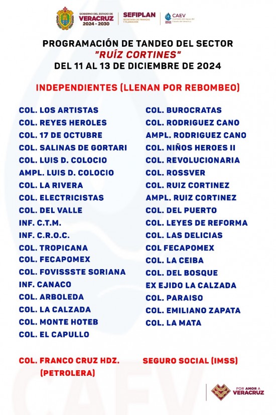 | Programación del tandeo sector 'Ruiz Cortines'. | ||||||