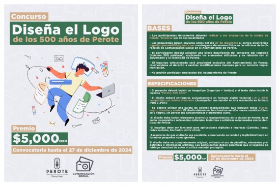💡 ¡Sé parte de la historia de Perote y deja tu huella creativa! Invitamos a todos los peroteños a participar en el diseño del logotipo conmemorativo de los 500 años de nuestra ciudad. Esta es tu oportunidad de aportar con tu talento al legado cultural e histórico de nuestro municipio. 🏆 Premio al mejor diseño: $5,000 MXN 🗓️ Convocatoria abierta hasta el 27 de diciembre de 2024 📬 Envía tu propuesta a: logotipo.perote500@gmail.com 💡 O entrégala físicamente en una memoria USB en las oficinas de Comunicación Social del Ayuntamiento, de Lunes a Viernes: 9:00 am - 3:00 pm. 📌 Consulta las bases y especificaciones. ✅ ¡Deja tu marca en los 500 años de historia de Perote con tu diseño! . |