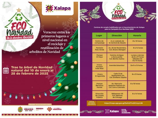 El Ayuntamiento de Xalapa y la Secretaría de Medio Ambiente de Veracruz (Sedema) invitan a participar en la campaña de reciclaje y reutilización de pinos navideños “Eco Navidad 2025”, que se desarrollará del 10 de enero al 28 de febrero. La directora de Medio Ambiente, Ana Isabel Guevara Escobar, expuso que el Gobierno Municipal de Xalapa se suma a esta iniciativa con el objetivo de brindar un destino final útil a los árboles navideños. Detalló que los pinos que se lleven a los centros de acopio serán reutilizados para compostaje, elaboración de cercas, jardineras y huertos, con lo que se promoverá la economía circular y evitará que los pinos acaben en la vía pública o el relleno sanitario. Detalló que la Dirección de Medio Ambiente habilitará centros de acopio en el Centro de Compostaje de la Central de Abasto, el Panteón Palo Verde, el vivero El Agrarista, el Parque Ecológico El Haya, el vivero forestal Valle Real, el parque Barranca Honda y las instalaciones de la Dirección de Limpia Pública. También se recibirán los pinos en los 16 centros comunitarios del Ayuntamiento. En los centros comunitarios Arroyo Blanco, Rafael Lucio, Plan de Ayala, Casa Blanca, El Moral, El Naranjal, Las Minas, Fovissste, El Olmo, Constituyentes, Tronconal, Chiltoyac, 6 de Enero y El Castillo, los centros de acopio funcionarán de lunes a viernes de 9:00 a 15:00 horas; los de Reforma y San Antonio Paso del Toro, de lunes a viernes de 9:00 a 18:00 horas. En el Centro de Compostaje se recibirán pinos de lunes a viernes de 8:00 a 15:00 horas; en Palo Verde de 8:00 a 14:00 horas; en el vivero El Agrarista de lunes a viernes de 8:00 a 13:00 horas; en el Parque Ecológico El Haya de lunes a viernes de 8:00 a 17:00 horas, y sábados de 8:00 a 14:00 horas. En Barranca Honda, de 8:00 a 16:00 horas, en la Dirección de Limpia Pública de 8:00 a 14:00 horas, y en el vivero forestal Valle Real, de 9:00 a 15:00 horas. Finalmente, la funcionaria reiteró la invitación a las familias para que con el mismo agrado con que en la temporada navideña fueron por sus pinos, ahora los lleven a los diferentes centros de acopio. |