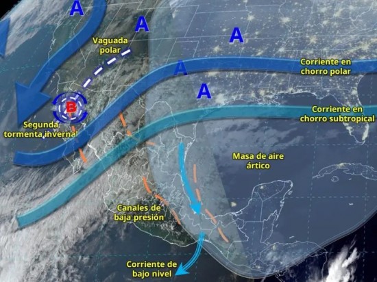 La segunda tormenta invernal, asociada con una vaguada polar, interaccionará con la entrada de humedad generada por las corrientes en chorro polar y subtropical, ocasionando ambiente muy frío a gélido y viento de 50 a 60 km/h con rachas de 80 a 100 km/h en el noroeste y norte de México, previéndose lluvias fuertes a muy fuertes en Sonora, Chihuahua, Coahuila, Zacatecas, Aguascalientes y el norte de Jalisco, con puntuales intensas en Durango, Sinaloa y Nayarit; así como condiciones para caída de nieve o aguanieve en sierras de Sonora, Chihuahua, Coahuila, Durango y Sinaloa, además de agua nieve en Zacatecas y Nuevo León. Por otra parte, un nuevo frente frío se aproximará e ingresará al norte y noreste del territorio nacional, interaccionará con un canal de baja presión extendido sobre el occidente del Golfo de México, propiciando lluvias puntuales fuertes en Nuevo León y Tamaulipas, así como intervalos de chubascos en San Luis Potosí y Veracruz, además de rachas de viento de 70 a 90 km/h en Nuevo León y San Luis Potosí. De acuerdo con el comunicado del organismo dependiente de la Comisión Nacional del Agua (Conagua), el ingreso de humedad del Océano Pacífico y Golfo de México originará lluvias e intervalos de chubascos en el centro, sur y sureste del país, incluidos el Valle de México y la península de Yucatán. Clima México: Temperatura máxima hoy 9 de enero de 2025 Para hoy 9 de enero de 2025 se pronostica ambiente caluroso en Colima, Michoacán, Guerrero (costa), Oaxaca (costa) y Chiapas (costa) con temperaturas de 35 a 40 °C. Así como temperaturas máximas de 30 a 35 °C en Jalisco, Puebla (suroeste) y Campeche. Clima en la CDMX y Edomex: se esperan heladas En el Valle de México se prevé hoy 9 de enero de 2025 cielo medio nublado con bancos de niebla, además de ambiente frío a muy frío, con temperaturas de -5 a 0 °C y heladas en zonas altas. Por la tarde, ambiente templado, cielo nublado con lluvias y chubascos dispersos en el Estado de México y lluvias aisladas en la Ciudad de México (CDMX). La temperatura mínima pronosticada para la CDMX será de 8 a 10 °C y la máxima de 21 a 23 °C. Para Toluca, Edomex, se prevé una temperatura mínima de 2 a 4 °C y una máxima de 17 a 19 °C. Clima en Nuevo León hoy 9 de enero de 2025 De acuerdo con el pronóstico, se esperan lluvias fuertes en Chihuahua, Coahuila, Nuevo León y Aguascalientes. Viento de dirección variable de 50 a 60 km/h con rachas de 80 a 100 km/h en Chihuahua y Durango; de 40 a 50 km/h con rachas de 70 a 90 km/h en Coahuila, Nuevo León, San Luis Potosí, Zacatecas y Aguascalientes. Existen condiciones para la caída de nieve o aguanieve en zonas serranas de Chihuahua, Durango y Coahuila, y agua nieve en Nuevo León y Zacatecas. |