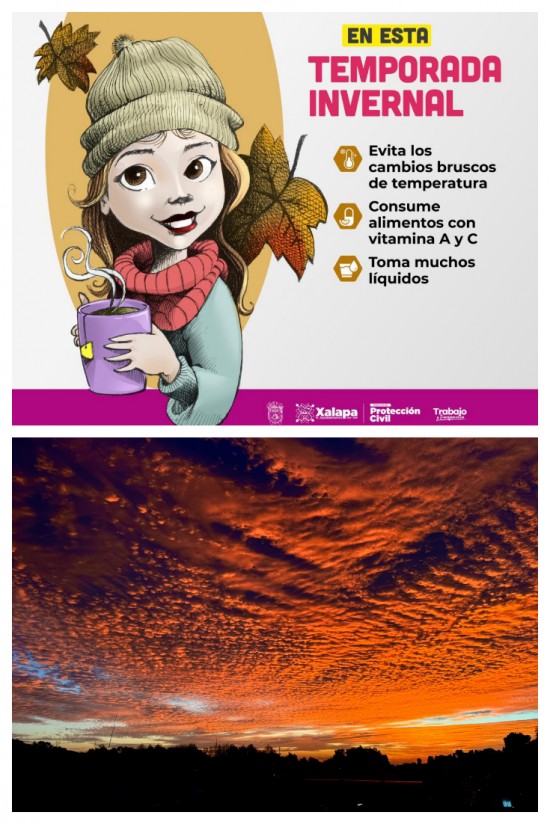 Ante el ingreso del Frente Frío 22, que podría generar algunas rachas de viento y descenso de la temperatura a partir de este viernes, la Dirección de Protección Civil Municipal exhorta a la población a extremar precauciones para prevenir afectaciones a la salud y accidentes. El director de Protección Civil, Luis Sardiña Salgado, expuso que de acuerdo con los pronósticos de la Comisión Nacional del Agua (Conagua), el Servicio Meteorológico Nacional (SMN) y la Secretaría de Protección Civil de Veracruz, este día por la tarde-noche se podrían registrar los efectos del Frente Frío 22. “Se tendrían algunas rachas de viento y descenso de la temperatura, por lo que hay que estar alerta. La recomendación a la población es que si no tiene que salir permanezca en casa, y si lo hace, se abrigue bien y cuide particularmente a niñas, niños, personas adultas mayores, con discapacidad, a la sociedad en general y a las mascotas”. El funcionario agregó que ante la posibilidad de que también se presente neblina, a los automovilistas y choferes en general se les recomienda mantener sus luces prendidas, conducir con velocidad moderada y con precaución. El Director de Protección Civil reiteró que es necesario estar pendiente de los pronósticos y avisos oficiales, cuidarse de las enfermedades respiratorias, y en caso de tener algún síntoma, acudir al doctor y centros de salud. Finalmente, dio a conocer que por los efectos del Frente Frío se podrían registrar temperaturas mínimas de hasta cinco grados, particularmente en los límites con los municipios de Banderilla y Tlalnelhuayocan. |