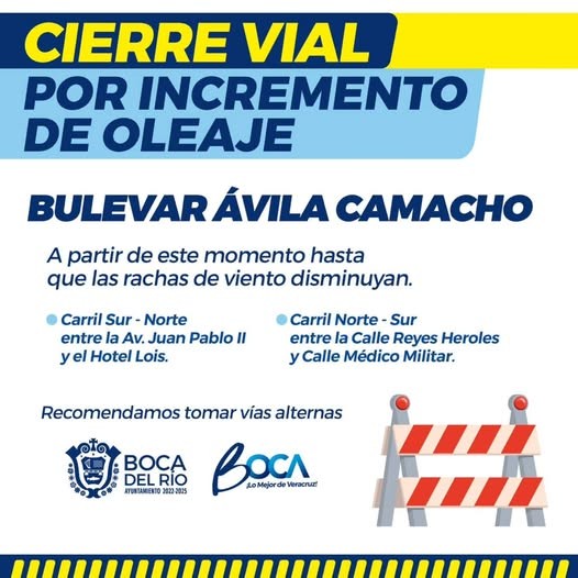 Por incremento de oleaje a partir de este momento hasta que las rachas de viento disminuyan. -Carril Sur- Norte entre la Av. Juan Pablo II y el Hotel Lois. -Carril Norte- Sur de Reyes Heroles a calle Médico Militar. 🚗 Recomendamos tomar sus precauciones. #BocadelRío #LoMejordeVeracruz |