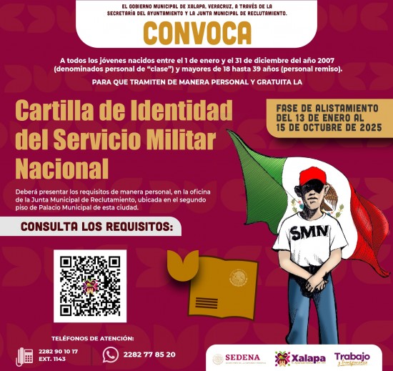 Xalapa, Ver.- El Ayuntamiento de Xalapa, a través de la Secretaría del Ayuntamiento y la Junta Municipal de Reclutamiento, convoca a los jóvenes de la Clase 2007 y Remisos, a tramitar la Cartilla de Identidad del Servicio Militar Nacional participando en la Fase de Alistamiento, que inicia este lunes 13 de enero y concluye el 15 de octubre.
