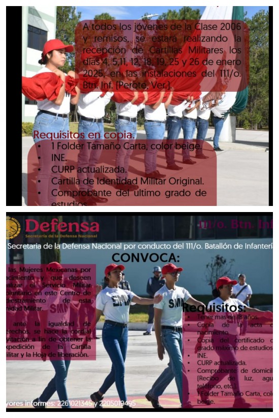 🔹 Clase 2006 y remisos: Recepción de cartillas del Servicio Militar Nacional. 🗓 Fechas: 4, 5, 11, 12, 18, 19, 25 y 26 de enero de 2025. 📍 Lugar: Instalaciones del 111/o Batallón de Infantería (Perote, Ver.). 🔹 Mujeres mexicanas: Participa en el Servicio Militar Voluntario y obtén la expedición de tu Cartilla Militar y Hoja de Liberación. Consulta los requisitos en las imágenes y cumple con tu compromiso con la nación. 📞 Informes: 2261021345 y 2205019495. ¡Un paso más hacia tu preparación y contribución al país! |