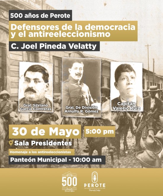 🔸 Gral. Silviano García Contreras 🔸 Gral. de División Arnulfo R. Gómez 🔸 Capitán Valerio Ruiz 📍 Sala Presidentes 🗓️ 30 de mayo 🕔 5:00 p. m. Además, acompáñanos al homenaje en el Panteón Municipal a las 10:00 a. m. Honremos la historia de Perote y de quienes defendieron con valentía los ideales democráticos. . . . Este programa es público, ajeno a cualquier partido político. Queda prohibido su uso para fines distintos a los establecidos en el programa. |