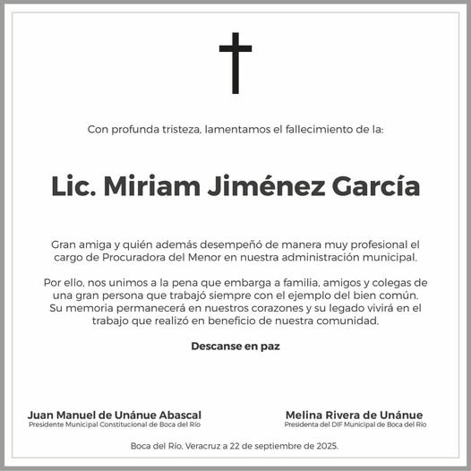 Boca del Río, Ver.- Con profunda tristeza nos unimos a la pena que embarga a la familia de una gran amiga, la Lic. Miriam Jiménez García, quien además desempeñó de manera muy profesional el cargo de Procuradora del Menor en nuestra administración municipal.