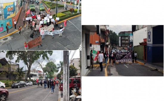 XALAPA.- Aunque desde la mañana de este jueves trabajadores de diferentes sucursales bancarias de Xalapa colocaron hojas de cimbraplay para proteger los ventanales de cristal de sus instalaciones, ante posibles desmanes en la marcha estudiantil por la masacre del 2 de octubre, en esta ocasión los estudiantes universitarios no hicieron vandalismo en ningún edificio público y ninguna sucursal bancaria. Lo anterior, a pesar de que esta tarde se realizaron no una, sino tres marchas de estudiantes de diferentes facultades de la Universidad Veracruzana UV, para conmemorar el 57 aniversario de la matanza de estudiantes de Tlatelolco, en la Ciudad de México en 1968. La primera marcha partió de la facultad de Humanidades, la segunda de Rectoría de la UV y la tercera de la facultad de Economía con dirección a la plaza Lerdo. Los estudiantes gritaron consignas y portaban grandes lonas y cartulinas alusivas con leyendas como "2 de octubre no se olvida" y "Somos la memoria viva el proletariado", entre otras.