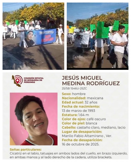 Con vestimenta blanca, pancartas y lonas, familiares, amigos y vecinos del municipio de Ángel R. Cabada marcharon para exigir a las autoridades la pronta localización de Hans Flores, estilista y residente de la zona, quien se encuentra desaparecido desde el pasado 20 de octubre. Hans Neftalí Flores Constantino de 34 años, fue visto por última vez el domingo 19 de octubre en la ciudad de Veracruz, desde su desaparición a, la incertidumbre y el dolor se han convertido en el motor de una campaña de difusión que busca el apoyo de toda la sociedad. Cada minuto cuenta, y por eso, familiares y amigos solicitan a quien tenga información, por mínima que parezca, que se comunique de inmediato con las autoridades, la Comisión Estatal de Búsqueda de Personas ya ha emitido una ficha de búsqueda y para cualquier información pone a disposición el número 2283-19-3187 o al número de emergencia 911. La manifestación se realizó este viernes de forma pacifica...LA COMISIÓN Estatal de Búsqueda Veracruz reporta la desaparición de Jesús Miguel Molina Rodríguez, en Manlio Fabio Altamirano, Veracruz. De acuerdo con la ficha de búsqueda emitida por la Comisión, el masculino de 32 años, fue visto por última ocasión el pasado 16 de octubre en el municipio también conocido como Purga. Las características del desaparecido son las siguientes: Mide 1.64 metros Tiene ojos café oscuro. Piel blanca. Cabello castaño claro, mediano y lacio. Como señas particulares, Jesús Miguel tiene una cicatriz en el labio, utiliza brackets, tiene tatuajes en ambos lados del cuello, así como en brazo izquierdo, en ambas manos y en el lado derecho de la cadera. Para aportar cualquier información que pueda ayudar a localizar al desaparecido se pone a disposición el número 228 319 3187 o al 9-1-1.