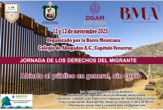 XALAPA.- Los integrantes de la Barra Mexicana Colegio de Abogados, AC. Capitulo Veracruz, convocaron a todos los abogados en el estado de Veracruz y al público en general, a la Jornada de los derechos de los migrantes, a realizarse el miércoles 12 y jueves 13 de noviembre, de 17 a 20 horas, en el Auditorio del Instituto de Ingeniería de la Universidad Veracruzana (Calzada Juan Pablo II Esq. Boulevard Adolfo Ruiz Cortines) Enfrente de Plaza Mocambo, en Boca del Río. Se trata de una materia que, afirmaron, “nos involucra como sociedad en general, para tener mayor certeza e información de los derechos de las personas en movilidad que transitan en nuestro Estado procedentes de otros países”. Señalaron que en este evento se contará con la presencia de autoridades estatales y federales que abrirán micrófonos para compartir datos relevantes, contando con diversas ponencias y la valiosa intervención de representantes Consulares en el estado, así como el Gremio de Las Patronas. De acuerdo con Felipe Fernández Fourzán presidente de la Barra Mexicana del Colegio de Abogados, los migrantes en su tránsito por el territorio nacional tienen los mismos derechos que cualquier mexicano y no pueden ser detenidos por su condición, sin embargo son objeto de distintas violaciones. Refirió que el abuso sexual, extorsiones, explotación laboral y discriminación son los principales delitos que se cometen contra los migrantes en su intento por cruzar a Estados Unidos, donde la mayoría desconoce sobre sus derechos y a quién pueden recurrir en busca de apoyo. “Estadísticamente tenemos tres a cuatro casos mensuales que apoyamos y los casos más graves son violaciones a menores y a mujeres y trata de personas, sucede aquí por parte de polleros y ese tipo de personas, los migrantes desconocen sobre sus derechos y abusan de ellos”, aseguró el abogado. En ese tenor, no descartó que en algunos casos los migrantes en medio de su desesperación se unan a grupos delictivos para trabajar y posteriormente son secuestrados o abandonados. El abogado de profesión indicó que la jornada de derechos de los migrantes busca difundir y concientizar los derechos y obligaciones de las personas en movilidad humana en el estado. “Nosotros estamos dando esta jornada para darlos a conocer, para que se sientan apoyados en todos los sentidos”, aseguró Fernández Fourzán. El evento se desarrollará en las instalaciones de la Universidad Veracruzana Campus Mocambo en Boca del Río y tendrá la colaboración de diferentes órganos de gobierno y autoridades del estado de Veracruz como representantes del Órgano de Administración Judicial del Poder Judicial del Estado de Veracruz; del Instituto Nacional de Migración; Gobierno del Estado de Veracruz, a través de la Dirección General de Atención a Migrantes; Cónsules de diversos países; Universidades del Estado; y la coordinadora de “Las Patronas”. Los organizadores pidieron confirmar asistencia al siguiente enlace: https://docs.google.com/forms/d/e/1FAIpQLScZAZxkMJOfI3hYkuHLLNRGB-1nAHp69NBA8TN-GtU5oqaEHA/viewform?usp=header