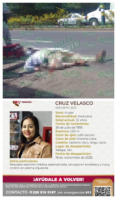 Un motociclista perdió la vida este jueves luego de sufrir un accidente sobre el bulevar Xalapa–Coatepec, a la altura del puente del río Consolapa y a pocos metros de las instalaciones del Café Myrna, en dirección hacia la capital. De acuerdo con los primeros reportes, el conductor perdió el control de la unidad al pasar por un tramo donde la carpeta asfáltica había sido raspada como parte de trabajos viales. La irregularidad del terreno habría provocado que derrapara y cayera, sufriendo lesiones que le costaron la vida de manera inmediata. Familiares del hombre arribaron al sitio para identificar el cuerpo. Señalaron que se dirigía a comprar un regalo para su hijo, quien cumple años este mismo día. Elementos de seguridad acordonaron la zona mientras se espera la llegada de personal de Servicios Periciales, quienes realizarán el levantamiento del cuerpo y las diligencias correspondientes...LA COMISIÓN Estatal de Búsqueda reportó la desaparición de Elizabeth Cruz Velasco de 32 años, en Xalapa, Veracruz. Detalla que la joven que fue vista por ultima vez el pasado 17 de noviembre mide 1.50 metros, es de tez morena clara, tiene ojos color café oscuro y el cabello castaño claro, largo y lacio. Como señas particulares, requiere atención médica especializada, tatuajes en el antebrazo y nuca, cicatriz en la pierna izquierda. Cualquier información que ayude a dar con su paradero, favor de reportarla al 911 o al 228 319 3187.