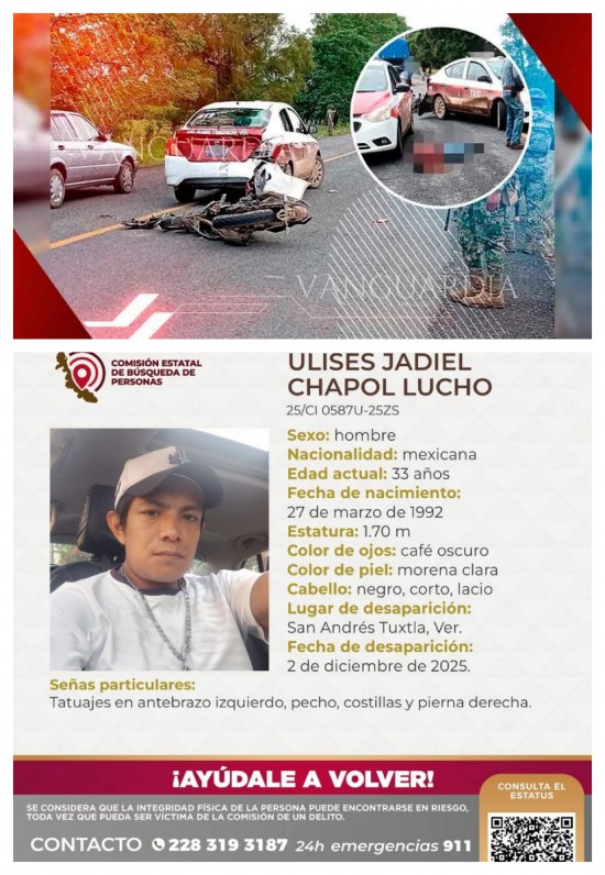 La madrugada de este miércoles fue privado de la vida un hombre en la colonia Laguna Estancada cerca de la Chatarrera en este municipio. El nombre del finado fue Ulises Javier Chapol Lucho de 33 años, que vestía playera tipo polo color negra y pantalón de mezclilla, y horas antes había sido reportado como desaparecido. Los hechos ocurrieron en la calle Primitivo R. Valencia donde sujetos desconocidos mataron a balazos a Ulises Jadiel, al sitio arribaron paramédicos quienes confirmaron que el joven ya no contaba con signos vitales por lo que las autoridades limitaron la zona. Policía Ministerial ya levantó indicios con lo que procederán a realizar la carpeta de investigación, el cuerpo fue trasladado al SEMEFO para realizarle la autopsia de rigor. De o los responsables no se sabe nada. Autoridades de peritos y policías arribaron al lugar para atender el caso que ocurre por segunda ocasión en el mismo lugar de esta ciudad...TRAS DÍAS internado en el Hospital IMSS Bienestar, el motociclista Lino H. M. falleció, debido el accidente ocurrido en la carretera Tuxpan–Tampico. Los hechos ocurrieron el pasado jueves 27 de noviembre, en el kilómetro 11 de la carretera antes mencionada, a la altura de la comunidad de Buenos Aires, perteneciente a este municipio. El ahora fallecido, quien contaba con 34 años y era originario de Isla del Ídolo, del municipio de Tamiahua, viajaba a bordo de una motocicleta Yamaha negra sin matrícula cuando se impactó contra la parte trasera de un taxi con número económico 419 del municipio de Álamo Temapache. Debido a la gravedad de las lesiones, fue trasladado de emergencia por paramédicos de Protección Civil y desde entonces permanecía bajo observación médica en el hospital donde su estado se mantuvo delicado hasta su fallecimiento. A la confirmación del deceso, elementos de la Policía Ministerial y peritos criminalistas acudieron al hospital para realizar el levantamiento del cuerpo, mismo que fue trasladado a las instalaciones del Semefo, donde se le practicará la necropsia de ley. Por su parte, un fiscal investigador continuará con la integración de la carpeta correspondiente para determinar en quién recae la responsabilidad del accidente que cobró la vida del motociclista.