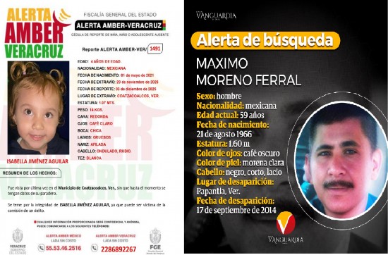XALAPA.- Una menor de tan solo 4 años de edad fue reportada como desaparecida desde el pasado 29 de Noviembre, en Coatzacoalcos. Se trata de la pequeña Isabella Jiménez Aguilar, por quien la Fiscalía General del Estado (FGE) emitió la ficha de búsqueda Alerta Amber 1491. Sin dar mayores detalles de la forma en la que desapareció, se informó que la menor nació el 31 de mayo del 2021, por lo que actualmente cuenta con cuatro años y medio de edad. Como señas particulares: mide 1.07 de estatura, es de tez blanca y redonda, ojos cafés claros, boca chica, labios gruesos, nariz afilada y cabello ondulado rubio. Fue vista por última vez en Coatzacoalcos; se desconoce su paradero y se teme por su integridad física, por lo que para cualquier información se aportaron los números 5543562516 y 2286892267 de la FGE….UN HOMBRE identificado como Maximino Moreno Ferral, de 59 años, fue reportado como desaparecido el 17 de septiembre de 2014, en Papantla. Desde entonces sus familiares no han dejado de buscarlo y piden que si alguien sabe de algo de él den aviso a las autoridades. El varón mide 1.60 metros, es de ojos color café oscuro, piel morena clara, cabello negro, corto y lacio; como señas particulares tiene un lunar pequeño de color negro en el lado derecho del rostro, a la altura de la mandíbula, y lunares rojos en el cuello. Para cualquier dato que tengan para ubicarlo pueden hacerlo llegar al teléfono de emergencias 911 o al 228319 3187 de la Comisión Estatal de Búsqueda.