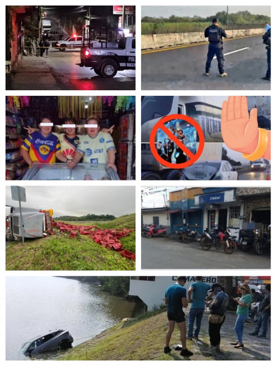 Masacre en Veracruz: matan a tres mujeres al interior de negocio en Tlapacoyan; Identifican a mujeres asesinadas en negocio de Tlapacoyan, eran abuela, madre e hija; Mujer motociclista pierde la vida en accidente en carretera Xalapa – Veracruz; Asaltan tráiler con logos de Junior Klan, en la autopista Perote – Cantona, el grupo se deslinda; Dos lesionados deja volcadura de camioneta en Huiloapan; Vuelca camión limonero en la autopista Cardel-Poza Rica; Se queda en prisión acusado de pederastia agravada en Texcatepec; Intensa movilización policíaca en Tuxpan por supuesto secuestro; Conductor cayó al río Jamapa con todo y camioneta, en Medellín de Bravo; Camioneta embiste a una mujer de la tercera edad que resultó politraumatizada, en Tuxpan; Anuncia UV suspensión de clases presenciales por evento de norte para el próximo lunes en zonas costeras; Suspenden clases por socavón a media aula del Centro de Atención Múltiple CAM-4, en Córdoba; Se registra operativo de Sedena en Potrero Nuevo y provoca persecuciones, disparos al aire y al menos un sujeto detenido; Conductor graba y exhibe a agente vial que pretende extorsionarlo con 12 mil pesos por un permiso inexistente, en Córdoba; Liberan a dos personas, detienen a 37 y decomisan más de 236 dosis de sustancias tóxicas en operativos en 20 municipios de Veracruz.