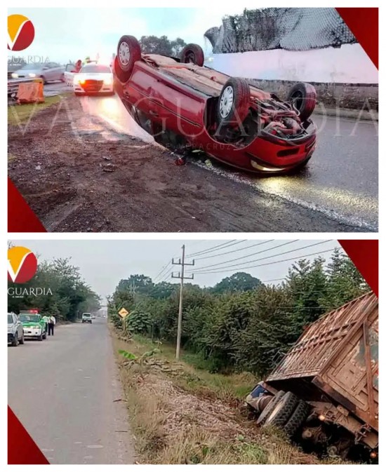 La volcadura de un auto particular se registró esta mañana sobre la autopista Puebla-Veracruz, a unos metros de la base de la Guardia Nacional, dejando dos personas lesionadas. El percance se suscitó cerca de las 07:30 horas de este jueves, en el kilómetro 268 de la vía de comunicación de cuota, luego de que el conductor de la unidad perdiera el control, ocasionando que la unidad derrapara, hasta terminar con las llantas hacia arriba. Elementos de la Policía Estatal acordonaron el área, mientras que los paramédicos de Caminos y Puentes Federales brindaron atención a los lesionados, quienes fueron trasladados a un hospital cercano. Finalmente, personal de la Guardia Nacional división Carreteras, tomó conocimiento y, después del peritaje, ordenó el arrastre de la unidad al corralón para los fines legales que correspondan... DEBIDO AL pésimo estado de la carretera que conduce a El Higo el conductor de una unidad pesada perdió el control del volante y terminara por sufrir una aparatosa volcadura; afortunadamente, resultó ileso. Los hechos acontecieron la mañana de este jueves 11 de diciembre en la carretera que conduce de la cabecera municipal, con dirección hacia la “Y”, a escasos metros del rancho “La Hormiga”. En el lugar, el conductor de un camión torton “Cañero” perdió el control de la unidad pesada tras esquivar unos baches, salirse del camino para finalmente terminar volcando. Al lugar rápidamente se trasladaron elementos de Protección Civil y de la Comisión Nacional de Emergencia (CNE), quienes le brindaron la atención al conductor de la pesada unidad, quien afortunadamente solo se llevó el susto de su vida. La unidad fue retirada del lugar con el apoyo de una grúa, mientras que de los hechos tomaron conocimiento autoridades viales.