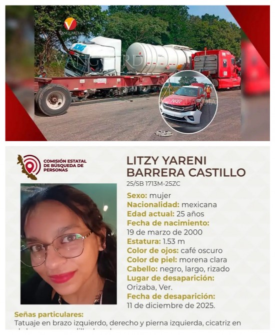 Operador de un tractocamión acoplado con dos plataformas vacías perdió el control de la unidad y provocó daños materiales a 11 vehículos que se encontró a su paso. Los hechos ocurrieron sobre el libramiento Portuario, vía que conecta la autopista México-Tuxpan con la zona Portuaria Aduanal. En este sitio, un tractocamión acoplado con dos plataformas, propiedad de la empresa Transportes Perea, con placas del Servicio Público Federal, colisionó con al menos 11 vehículos, provocándoles daños materiales superiores al orden de los 2 millones de pesos. Entre las unidades más afectadas se encuentran una pipa que transportaba diésel y se encontraba estacionada a un costado de la carretera. Otro de los vehículos con más afectaciones es el taxi Chevrolet Aveo, colores oficiales, con número económico 1037. Es de mencionar que elementos de tránsito municipal, a su arribo, retiraron de forma inmediata a los otros vehículos afectados, toda vez que presentaban daños mínimos y no afectaban su movilidad; sin embargo, estos no se presentaron en las oficinas para el reclamo de afectaciones. De acuerdo con la información obtenida, se pudo conocer que el operador del tractocamión con doble plataforma acoplada se desplazaba por la vía mencionada en dirección a la zona portuaria cuando de forma repentina, desde una curva, como si no perdiera el control, chocó con diversos vehículos a su paso; el taxi fue el penúltimo de las unidades afectadas para posteriormente terminar impactado en la pipa transportadora de diésel. Operarios de la empresa Grúas Tuxpan acudieron al lugar para hacer el retiro de los vehículos dañados. En este orden de ideas, aseguradores de los vehículos afectados argumentaron que los daños materiales provocados oscilan entre los 2 millones de pesos...LA COMISIÓN Estatal de Búsqueda reportó la desaparición de Litzy Yareni Barrera Castillo, de 25 años en Orizaba, Veracruz. La joven mide 1.53 metros, es de tez morena clara, tiene ojos color café oscuro y el cabello negro, largo y rizado. Como señas particulares, tiene tatuaje en el brazo izquierdo, derecho y pierna izquierda, cicatriz en abdomen y en la rodilla derecha. Cualquier información que ayude a dar con su paradero, favor de reportarla al 911 o al 228 319 3187.