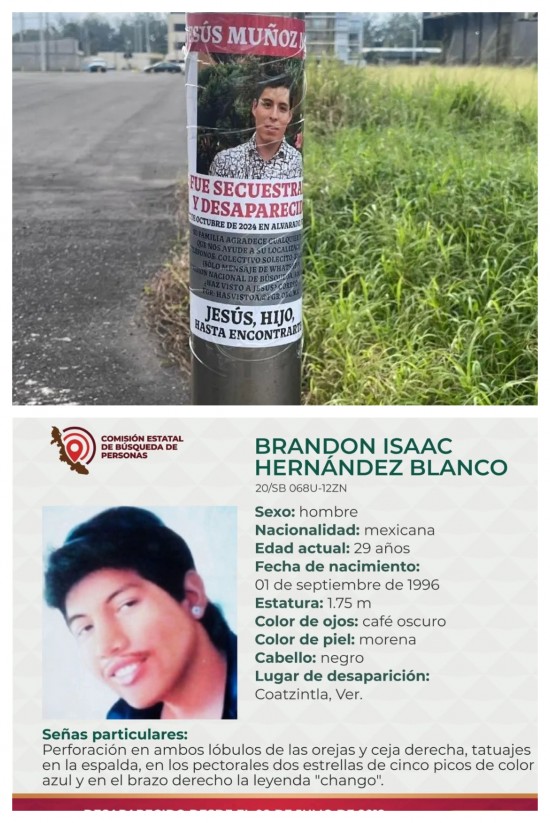 Después de más de 13 años de búsqueda, este lunes 19 de enero de 2026 fueron restituidos a su familia los restos de Brandon Isacc, quien fue privado de la libertad en Coatzintla, en junio de 2012 cuando apenas tenía 15 años; la entrega se realizó tras concluir el proceso de identificación forense. De acuerdo con información del Colectivo de Familiares en Búsqueda María Herrera, el adolescente fue sustraído de manera violenta el 9 de junio de 2012 junto con al menos otros cuatro menores. Dos días después, el 11 de junio, los cuerpos de catorce personas fueron localizados en una camioneta abandonada en la comunidad Potrero del Llano, municipio de Álamo Temapache. Los restos se encontraban fragmentados y distribuidos en aproximadamente 30 bolsas. Inicialmente, la familia no presentó denuncia por temor a represalias, lo que retrasó el inicio formal de la búsqueda. Fue hasta el año 2020, con la llegada de la Brigada Nacional de Búsqueda a Poza Rica, cuando se retomaron las diligencias ante autoridades ministeriales y periciales. Durante la revisión de registros del entonces Instituto de Medicina Forense, la madre de Brandon identificó un tatuaje que permitió vincularlo con uno de los cuerpos localizados en 2012. Los restos habían sido enviados previamente a una fosa común en el municipio de Tuxpan. Tras diversos procedimientos técnicos y periciales, se logró confirmar su identidad. Las organizaciones acompañantes señalaron que el caso refleja la persistencia de la violencia contra menores y jóvenes en la región, así como las dificultades que enfrentan las familias para acceder a la verdad y la justicia en casos de desaparición forzada...A UN AÑO tres meses de la de desaparición Jesús Muñoz Mata, decenas de elementos de distintas corporaciones de seguridad, acompañados por familiares, llevaron a cabo acciones de búsqueda el bulevar Manuel Ávila Camacho, en el municipio de Boca del Río para localizarlo. Las labores se concentraron en la banqueta y la glorieta anteriormente conocida como la de los Voladores de Papantla, en un área de alta afluencia comercial. Ahí, los participantes colocaron fichas de búsqueda con la fotografía y señas particulares del joven, además de realizar recorridos en la zona de playa para intentar ubicar algún indicio. Jesús Muñoz Mata, de 35 años, permanece desaparecido desde el 20 de octubre de 2024, cuando fue secuestrado en el municipio de Alvarado, Veracruz. A pesar de que su familia accedió a las exigencias económicas de los captores, hasta la fecha no se tiene información sobre su paradero. Jesús es sobrino de la periodista Gloria Muñoz, quien junto a familiares ha solicitado el apoyo de la ciudadanía para compartir su ficha de búsqueda difundida por la Fiscalía General de la República (FGR) a través del programa “¿Has visto a…?”. Jesús Muñoz mide 1.70 metros, tiene ojos chicos de color café oscuro, cabello ondulado negro y tez morena clara. Como señas particulares, presenta una cicatriz en la frente, otra por quemadura en el brazo derecho, así como un lunar en la pantorrilla y otro debajo del ojo derecho. El registro oficial de la FGR es el 538/DS/2025. Cualquier información puede ser reportada al correo electrónico hasvistoa@fgr.org.mx, al portal hasvistoa.fgr.org.mx o al número 55 80 59 66 74. La familia hace un llamado especial a las comunidades de Veracruz y Quintana Roo para colaborar en la difusión del caso y apoyar en la localización de Jesús.