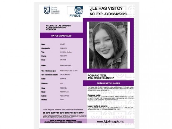 De acuerdo al boletín de búsqueda que emitió la Fiscalía General de Justicia (FGJ) de la Ciudad de México, Rosario Itzel Avalos de 26 años fue vista por última vez en la colonia Santa Anita, alcaldía Iztacalco. El día en que desapareció, la mujer vestía chamarra color negro, pantalón de color claro y tenis color negro. Como señas particulares tiene un tatuaje de una medusa en el estómago y una rosa en el pecho. Hoy, amigos y familiares de la agente se manifiestan a las afueras de la FGJ, para exigir la búsqueda y localización de la policía, quien se encarga de la seguridad en el Pilares de Santa Anita. Javier Hidalgo, coordinador de Pilares en la CDMX, informó que la última vez que vieron a la uniformada fue cuando terminó su turno a las 9 de la mañana el 29 de noviembre. Detalló que Itzel es madre de dos menores de edad y que recientemente había denunciado que fue víctima de abuso sexual al interior del centro recreativo. |