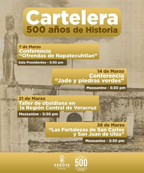 ¡No te lo pierdas! 📅 7 de marzo | “Ofrendas de Napatecuhtlan” 📍Sala Presidentes - 5:30 pm 📅 14 de marzo | “Jade y piedras verdes” 📍Mezzanine - 5:30 pm 📅 21 de marzo | Taller de obsidiana en la Región Central de Veracruz 📍Mezzanine - 5:30 pm 📅 28 de marzo | “Las Fortalezas de San Carlos y San Juan de Ulúa” 📍Mezzanine - 5:30 pm 🎟️Entrada libre. ¡Te esperamos! |